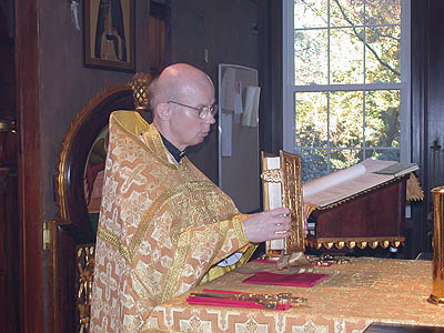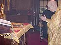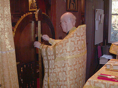 | While incensing the altar table he recites lines which confess the fullness of Christ’s presence, in the grave, in death, in paradise, at the right hand of the Father, “filling all things, Thyself uncircumscribed.” He also recites Psalm 51: “Have mercy on me, O God.” |